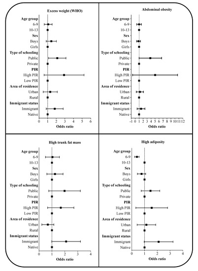 The following are available online at https://www.mdpi.com/2227-9067/7/11/201/s1, Table S1. Prevalence of having excess weight, abdominal obesity, high trunk fat mass, and high adiposity according to the different sociodemographic factors; Table S2. Association of having excess weight, abdominal obesity, high trunk fat mass and high adiposity according to different sociodemographic factors.