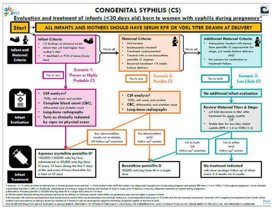 - CDPH. Congenital Syphilis Algorithm. California Department of Public Health. 2019. Available online: https://www.cdph.ca.gov/Programs/CID/DCDC/Pages/CongenitalSyphilis.aspx (accessed on 29 September 2020).