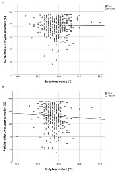 Maintaining optimal body temperature remains a challenge in neonatal intensive care. In 1997, the World Health Organization (WHO) defined the normal range of body temperature in newborn infants between 36.5–37.5 degrees Celsius (°C) [1]. However, Knobel et al. observed that the maximized normal heart rate (HR) observations occurred when the neonates body temperature was 36.8–37.0 °C [2], and Lyu et al. described the lowest rates of adverse neonatal outcomes in preterm infants with body temperatures of 36.5–37.2 °C [3]. Generally, the body temperature of newborn infants varies widely and depends on different variables such as postnatal age, location of measurement, and the method to determine body temperature [4,5,6]. Both hypothermia and hyperthermia are associated with increased mortality and morbidity [3,7]. The incidence of neonatal hypothermia is up to 84% in developing countries [8] and up to 53% in Europe [9], whereby preterm neonates are more often affected compared to term neonates because of differences in body temperature management [10]. Pichler et al. reported that body temperature correlated with peripheral muscle tissue oxygenation, measured by near-infrared spectroscopy (NIRS), in newborn infants who were admitted to the neonatal intensive care unit [11]. Whether body temperature affects both peripheral and cerebral tissue oxygenation in newborn infants during fetal-to-neonatal transition remains unclear.
