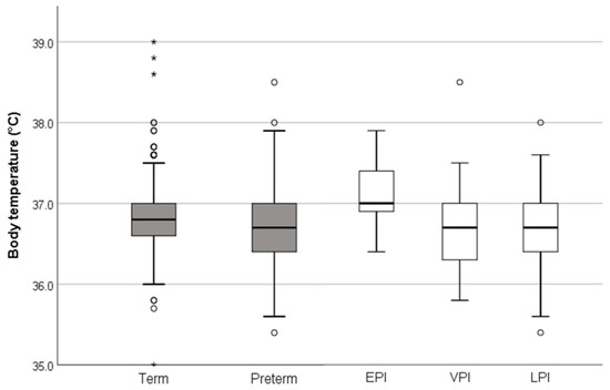 Boxplot (box: median, 1st and 3rd quartile; whisker: lower and upper extreme within 1.5 times the inter-quartile range from the upper or lower quartile; O: outliner >1.5 to <3 times the interquartile range from the upper or lower quartile, *: extreme outliner ≥3 times the interquartile range from the upper or lower quartile; highest and lowest extreme outliner demonstrate minimum and maximum range) of body temperature (°C) according to gestational age: term (≥37+0 weeks of gestation), preterm (<37+0 weeks of gestation) and subgroups EPI (extremely preterm infants ≤28+0 weeks of gestation), VPI (very preterm infants >28+0 and <32+0 weeks of gestation), and LPI (late preterm infants ≥32+0 and <37+0 weeks of gestation).