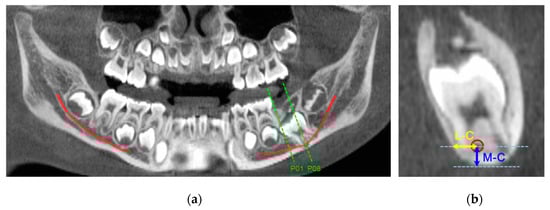 Cone-beam computed tomography (CBCT) imaging of study patients analyzed using OnDemand 3D software. (a) Reconstructed panoramic view with nerve tracing in permanent mandibular first molars (PM1) areas. Red lines indicate positions of the mandibular canals on this panoramic view. The green line (noted P01) indicates the first measurement point on the cross-sectional view of this PM1 in the ED group; (b) Cross-sectional CBCT image displaying measurement point P08. M–C refers to the distance from the most inferior margin of the mandible to the center of the mandibular canal. L–C refers to the distance from the outer margin of the lingual cortex to the center of the mandibular canal. A red circle indicates the mandibular canal.