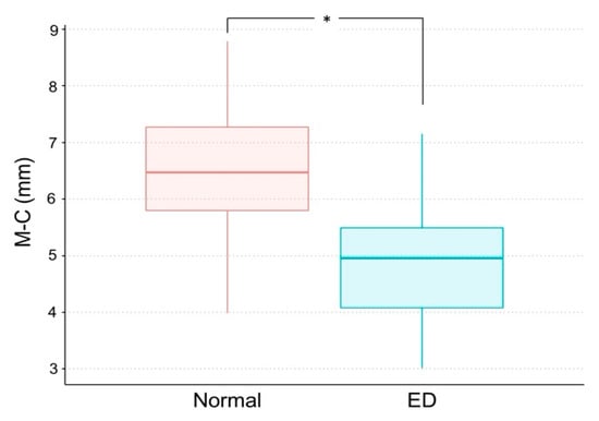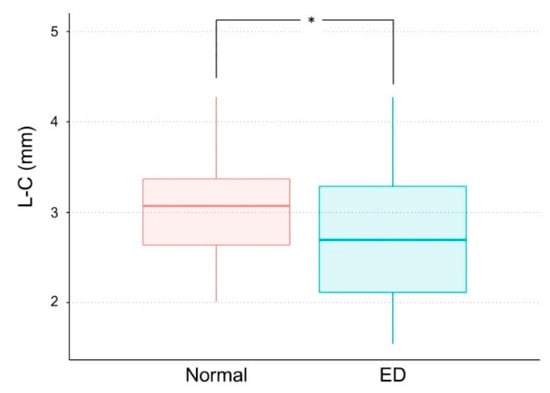The mean M–C was significantly shorter in the ED group (4.86 ± 1.07 mm) than in the normal group (6.56 ± 1.06 mm) (p < 0.05) (Table 3, Figure 2). The mean L–C was also significantly shorter in the ED group (2.74 ± 0.74 mm) than in the normal group (3.09 ± 0.71 mm) (p < 0.05) (Table 3, Figure 3). Figure 4 and Figure 5 show box plots for comparisons of mean M–C and L–C values obtained at each measurement point in the normal and ED groups.