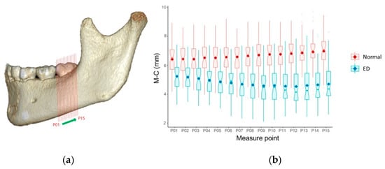 Mesiodistal position of the mandibular canal in relation to permanent mandibular first molar (PM1). (a) Reconstructed lateral view of the mandible with PM1 and measurement points; (b) Box plots for comparison of mean values of the distance from the most inferior margin of the mandible to the center of the mandibular canal (M–C) at each measurement point in the normal and eruption disturbance (ED) groups. The dots in the center of the boxes are mean values. These values indicate the mesiodistal position of the mandibular canal at each measurement point.