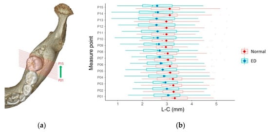 Buccolingual position of the mandibular canal in relation to PM1. (a) Reconstructed axial view of mandible with PM1 and measurement points; (b) Box plots for comparison of mean values of the distance from the outer margin of the lingual cortex to the center of the mandibular canal (L–C) at each measurement point in the normal and eruption disturbance (ED) groups. The dots in the center of the boxes are mean values. These values indicate the buccolingual position of the mandibular canal at each measurement point.