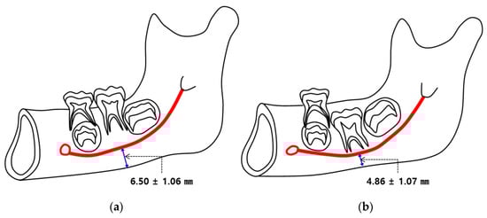 The mandibular canal is an anatomical structure within the mandible containing the IAN, artery, and vein [20,27]. The IAN can be observed in the mandibular process by approximately 5 weeks after conception [28]. The relative position of the mandibular canal in the mandible changes during a child’s functional progression from suckling to the early stages of mastication [29]. As masticatory muscle activity stimulates bone growth, growth of the buccal cortical bone in the mandible moves the mandibular canal relatively more lingually [29]. Further, the position of the mandibular canal within the mandible varies depending on age, gender and race [21]; however, the relative position of the mandibular canal at the levels of the mandibular foramen, PM1, and mental foramen tend to remain constant regardless of age or gender [30]. Yeh et al. also reported that there were no significant differences in the distance from the IAN to the IBM (inferior border of the mandible) on the left or right sides, indicating that the location of the mandibular canal tends to be similar bilaterally if the mandibular shape is symmetrical and if there are no eruptive disorders of mandibular molars [31].