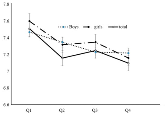Adjusted sleep duration according to body mass index in both sexes. BMI: Body mass index. Adjusted for age, smoking, alcohol, physical activity, income, energy intake, each P value < 0.05. Q1: lowest BMI quartiles, Q2: middle–low BMI quartiles, Q3 middle–high BMI quartiles, Q4: highest BMI quartiles.