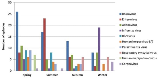 In comparisons between non-hospitalized and hospitalized episodes and between children with positive and negative results for each respiratory virus, Kruskal–Wallis and chi-square tests were conducted for continuous and categorical variables, respectively. Statistical analyses were performed using SPSS 21 (IBM Corporation, Armonk, NY, USA), and statistical significance was defined as a p < 0.05. This study was approved by the Institutional Review Board of Daejeon St. Mary’s Hospital with a waiver of receiving informed consent (approval number: DC20RASI0057).