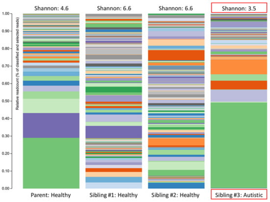 The stacked bar plots show the bacterial alpha diversity in the gut microbiome of a patient with autism spectrum disorder (Sibling #3) and the patient’s healthy biological triplet siblings and mother. Alpha diversity was quantified using the Shannon Index.
