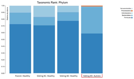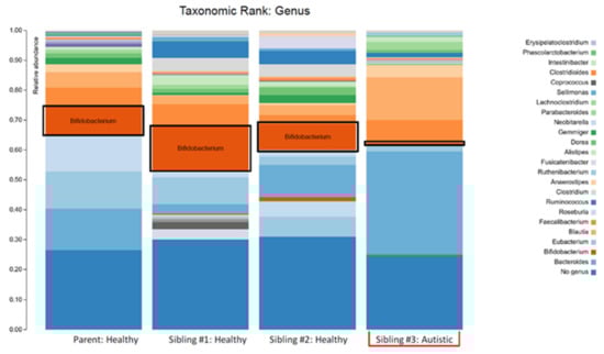 The plots in Figure 1 make two things clear: (i) the profile of the mother was different (less diverse) than siblings #1 and #2 and (ii) sibling #3 (with ASD and GI symptoms) had a profile that was markedly different from her two healthy siblings. The lower alpha diversity, higher Bacteroidetes:Firmicutes ratio, and findings of increased abundance of Proteobacteria and decreased abundance of Actinobacteria (especially the anti-inflammatory genera Bifidobacterium) in sibling #3 are in agreement with other studies that have compared the intestinal microbiota in ASD patients with healthy controls (reviewed in []) and therefore provide additional support for the concept of ASD-specific features of intestinal dysbiosis. An alternative explanation could be that the dysbiosis seen in sibling #3 is partially or largely due to her GI symptoms, but since the primary GI symptom was reflux (i.e., upper GI), it seems more likely that the dysbiosis is related to the ASD status, and therefore, the agreement with other findings in children with ASD is important.