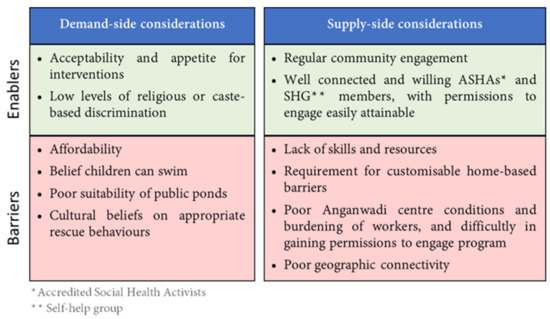 ASHA workers were interested in supporting the dissemination of drowning reduction programs and were considered suitable for providing training due to their reputation as health workers. ASHA workers were already regularly visiting mothers and children up to the age of 5 years old and could encourage the use of drowning interventions and conduct checks of home-based barriers. However, some participants noted that not all ASHA workers had strong relationships with communities, where their health communications such as community meetings were now largely ignored due to fatigue with repeated advice and instructions (Ref 35 in Table S2).