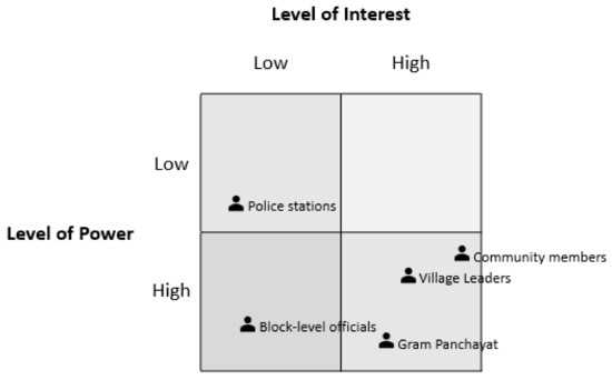 As per the placement on Mendelow’s Matrix, community members, village leaders and Gram Panchayats had high levels of power over program implementation and a high level of interest. Hence, these stakeholders should be actively and directly engaged in intervention design, development and implementation. Block-level officials have a high level of power, but lower levels of interest and should be engaged for permission and kept informed.
