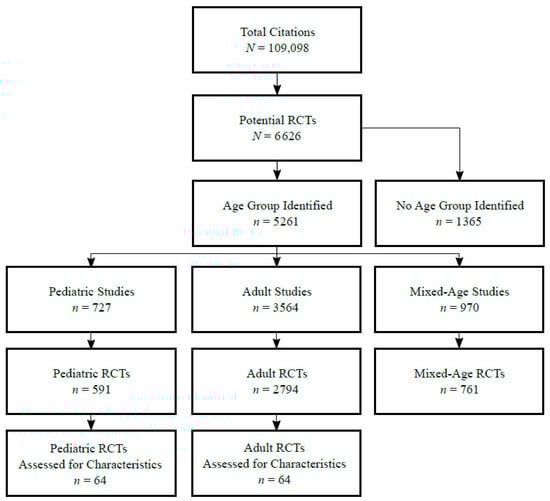 Randomized controlled trials (RCTs) are regarded as the “gold standard” in interventional research design [1]. Results of RCTs, when used judiciously in an evidence-based context, have potential to improve health outcomes [2,3]. Childhood illness comprises a significant portion of global disease burden, with persons aged 0–19 years old comprising approximately 26.2% of all-cause disability-adjusted life years (DALYs) as of 2019 [4]. Despite this, there exists a mismatch between pediatric RCT activity and pediatric disease burden [5]. Previous studies from over a decade ago have noted this paucity of pediatric RCTs in published literature, particularly in general medical journals [6,7,8].