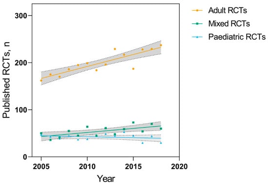 Number of adult, pediatric, and mixed-age RCTs published per year from 2005–2018 in seven high-impact general medical journals (GMJs). Shaded areas represent 95% confidence bands for each linear regression.