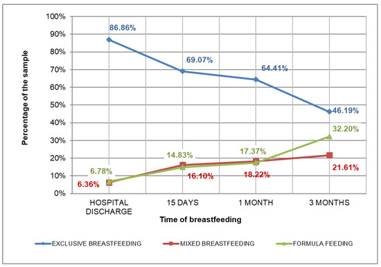 In this study, we aimed to identify the most crucial periods for the abandonment of EB before the mother starts or returns to work. In Spain, every woman in paid employment is entitled to maternity leave, paid at 100% for 16 weeks following childbirth [25,26]. In addition, we had the following secondary aims: (a) to identify the prevalence of the different ways of feeding milk upon discharge from hospital, at 15 days, at one month and at three months in a healthcare area which does not yet have BFHI accreditation; and (b) to determine the factors that have the strongest influence on early abandonment at this stage, which is highly significant in the process and practice of breastfeeding.