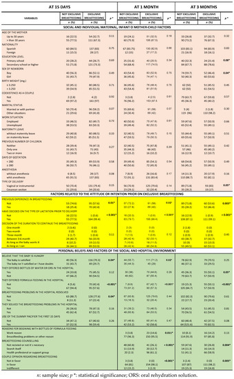 The commencement and maintenance of exclusive breastfeeding (EB) are dependent on several mother–infant factors. To analyse the prevalence of EB during four different periods and to analyse the factors that can affect its maintenance, we performed a prospective, observational, longitudinal study of 236 mothers and their child between 37 and 42 weeks of gestation and weighing more than 2.5 kg. Four interviews were conducted (T1: on discharge, T2: at 15 days, T3: at one month, T4: at three months). The results showed that EB decreased considerably at three months (69.5% vs. 47.46%). The factors that reduced the risk of abandonment were as following: having decided before giving birth that one wants to offer breastfeeding (T2: odds ratio (OR): 0.02, p = 0.001), T3 (OR: 0.04, p = 0.001) and T4 (OR: 0.07, p = 0.01)) and having previous experience with EB (T2 (OR: 0.36, p = 0.01), T3 (OR: 0.42 p = 0.02) and T4 (OR: 0.51, p = 0.03)). The factors that increased the risk of EB abandonment were offering feeding bottles in the hospital (T2 (OR: 11. 06, p = 0.001); T3 (OR: 5.51, p = 0.001) and T4 (OR: 4.43, p = 0.001)) and thinking that the infant is not satisfied (T2 (OR: 2.39, p = 0.01) and T3 (OR: 2.34, p = 0.01)). In conclusion, the abandonment of EB in the first three months is associated with sociodemographic and clinical variables and psychological factors such as insecurity and doubts of the mother during the process and the absence of a favourable close environment.