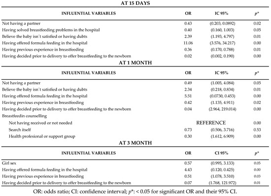 The results obtained from the different factors of influence have been classified taking into account the most critical periods for the cessation of breastfeeding, at 15 days, first month and at 3 months (Figure 4).