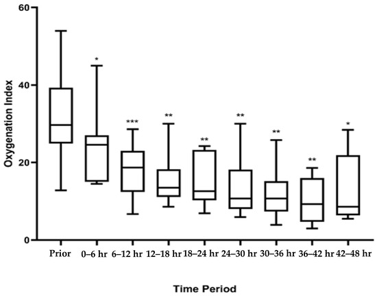 Oxygenation Index Trends After Starting Rotational Bed Therapy. Figure Legend: Comparison of oxygenation index trends prior to prone positioning and then after at 6 h intervals for the first 48 h. After prone positioning oxygenation indices improved over time. Oxygenation indices reported as medians, IQR, and ranges for each period examined. * = p-value < 0.05, ** = p-value < 0.01, *** = p-value < 0.001.
