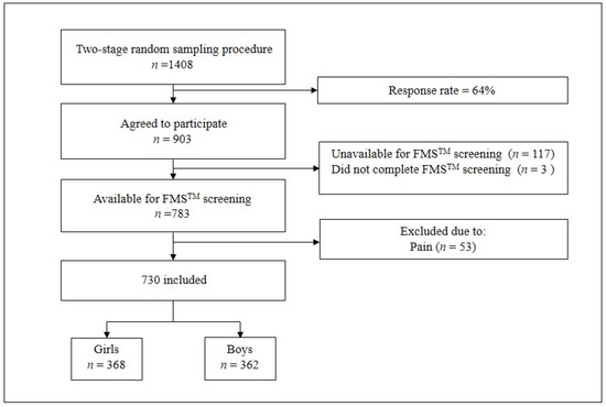 This investigation is a part of the Croatian physical activity in adolescence longitudinal study (CRO-PALS) conducted in a representative sample of urban youth (city of Zagreb, Croatia). This study was performed during the second wave of assessments, and all measurements were taken in 2015, during March, April, and May. Information about the procedures of the CRO-PALS longitudinal study have been documented in previous research [26]. In brief, using stratified two-stage random sampling procedures (school level and class level), 54 classes in 14 secondary schools were selected to participate in the CRO-PALS study (schools were stratified by type: grammar schools/vocational schools/private schools). All 1408 students in the selected classes were approached, and 903 agreed to participate (response rate = 64%). One hundred and twenty participants were unavailable on the day of testing or did not complete the FMSTM screening. Of one hundred and twenty participants, one hundred and seventeen were unavailable on the day of testing because they were missing from the school at the time of the measurements, whereas three subjects did not complete FMSTM screening due to lack of time (1 girl and 2 boys). As a consequence, we included data from 783 adolescents. All the participants had to meet certain criteria for the medical doctor to perform the screening process, specifically: (1) not having any pain during the movement screening (i.e., FMSTM testing procedures), (2) not having an acute medical condition that precluded FMSTM testing (neurologic disorders or serious orthopedic trauma such as bone fractures or complete muscle ruptures). Accordingly, 53 subjects were excluded. Therefore, the total number of participants that were analyzed was 730 (girls, n = 368, mean age ± SD = 16.6 ± 0.4 years old (yo), mean weight ± SD = 60.1 ± 9.3, mean height ± SD = 166.3 ± 6.4; boys, n = 362, mean age ± SD = 16.7 ± 0.4 yo, mean weight ± SD = 71.7 ± 12.5, mean height ± SD = 179.0 ± 7.2). The flowchart of the included participants is shown in Figure 1.