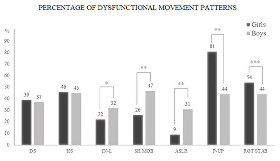 Proportion (%) of adolescent girls and boys who performed dysfunctional movement (DFM) in each Functional Movement Screen™ (FMSTM) test. Note: DS: deep squat; HS: hurdle step; IN-L: inline lunge; SHO MOB: shoulder mobility; ASLR: active straight leg raise; P-UP: Trunk stability push-up; ROT STAB: rotary stability. * p = 0.0009; ** p < 0.0001; *** p = 0.0075.