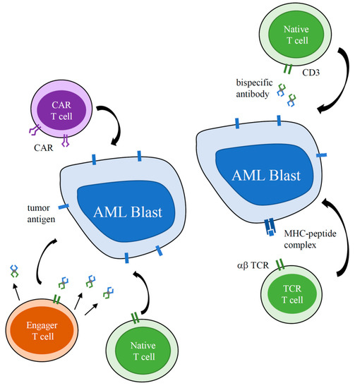 Strategies to Harness T Cells for Immunotherapy of acute myeloid leukemia (AML). CAR—chimeric antigen receptor, TCR—T-cell receptor, MHC—major histocompatibility complex.