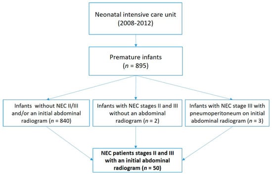 The study included analysis of ARs from 50 preterm infants with NEC: 29 with medical and 21 with surgical NEC (≥stage II). All the patients were treated at the neonatal intensive care unit in the period 2008–2012 (please see the flowchart below).