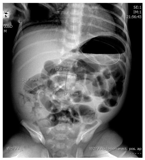 - Martins, D.L.; Gonçalves, A.; de Castro Dabus, G.; Bustorff-Silva, J.M.; Olímpio, H.O.; Alvares, B.R.; Sbragia, L. Dilatation of bowel loops on radiological images: Prognostic value in necrotizing enterocolitis. Radiol. Bras. 2007, 40, 297–301. [Google Scholar] [CrossRef][Green Version]