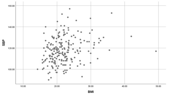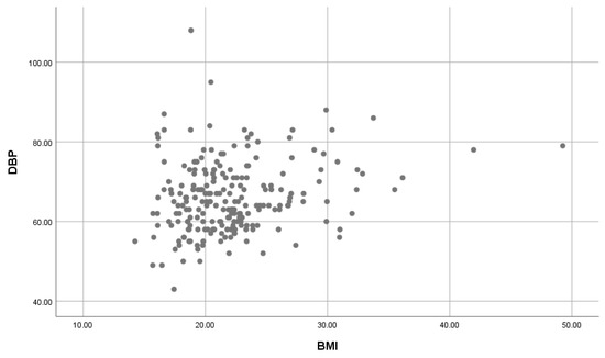 A significant weak positive correlation of BMI on SBP (Figure 3) and BMI on DBP (Figure 4) was found (r = 0.254, r = 0.216, both with a p-value = 0.001).