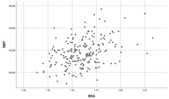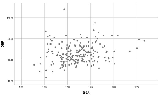 A significant, moderate positive correlation was found between BSA on SBP (Figure 5) was found (r = 0.407, p-value = 0.001); and a significant, weak positive correlation between BSA and DBP (Figure 6) was found (r = 0.183, p-value = 0.007).