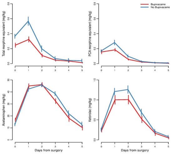 Current pediatric pain trial recommendations include comparing opioid use in the intervention and control group as a proxy for the efficacy of an analgesic modality [36]. As such, this analysis focused on postoperative analgesic use on the day of and the day following surgery, because previous research with bupivacaine in adults has found that it significantly reduced postoperative pain for at least a 24-h period [29,32,33,38]. Specific analgesics of interest were opioids (i.e., fentanyl, hydromorphone, morphine) as well as basic analgesia (the non-steroidal anti-inflammatory ketorolac, and acetaminophen). The pharmacological aspect of the multimodal analgesia protocol on the CVCC during the study period included scheduled acetaminophen (initially intravenously, switched to enteral administration) and, if approved by the cardiac surgeon, intravenous ketorolac (switched to enteral ibuprofen or celecoxib). Regarding opioid use, patients most commonly received fentanyl, followed by hydromorphone, and/or morphine. The route of administration on the day of surgery and postoperative day 1 was a continuous opioid infusion plus a nurse- or patient-controlled analgesia (PCA) bolus. Starting doses (titrated to effect) were fentanyl 1 mcg/kg/h (max. 50 mcg, plus PCA bolus of 1 mcg/kg), hydromorphone 2–3 mcg/kg/h (max. 100–150 mcg, plus PCA bolus of 2–3 mcg/kg), or morphine 20 mcg/kg/h (max. plus PCA bolus of 20 mcg/kg). If opioid-induced side effects were not manageable by low-dose intravenous naloxone 0.5–2 mcg/kg/h, an opioid rotation was undertaken at equianalgesic doses [39]. The patients were transitioned to oral pain medications as soon as oral intake was safe and well-tolerated.