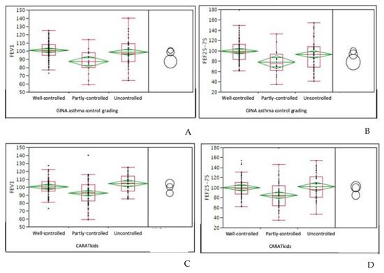 (A): associations between FEV1 (forced expiratory volume in 1 s) and GINA (Global Initiative for Asthma) asthma control grading in the whole sample; (B): associations between FEF25–75 (forced expiratory flow at 25–75% of vital capacity)and GINA asthma control grading in the whole sample; (C): associations between CARATkids (CARATkids: Control of Allergic Rhinitis and Asthma Test of pediatric version) grading and FEV1 in children; (D): associations between CARATkids grading and FEF25-75 in children. Data are expressed as medians and interquartile ranges. An ANOVA test was used. Circles concern the All-pairs Tukey-Kramer test.