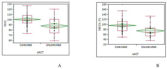 (A): comparison of FEV1 values between controlled and uncontrolled asthmatic children evaluated by cACT; (B): comparison of FEF25-75 values between controlled and uncontrolled asthmatic children evaluated by cACT (Asthma Control Test in children). Data are expressed as medians and interquartile ranges. The T-test was used.