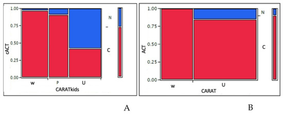 (A): comparison between cACT grades and CARATkids grades in children; (B): comparison between ACT grades and CARAT grades in adolescents. W = well-controlled asthma; P = partly-controlled; U = uncontrolled according to GINA classification. N = not controlled; C = controlled according with CARAT/CARATkids. A 1 value means 100% consistency between tests. X square test.