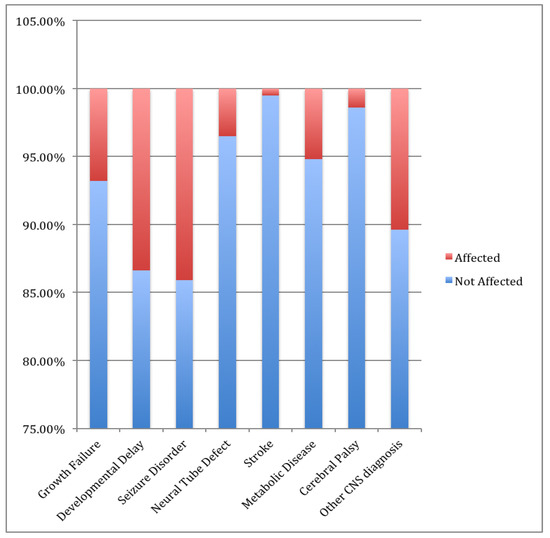 Frequencies of neurological diagnoses. Abbreviations: CNS, central nervous system. Red color reflects those who are affected with neurological disease. Blue color reflects those who are not affected with neurological disease.