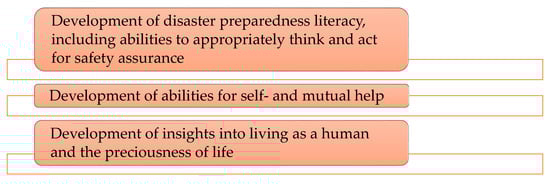 Finally, the “development of insights into living as a human and the dignity of life” includes developing insight into the dignity of life and consideration of others, the importance of protecting one’s life, and empathy towards disaster victims.