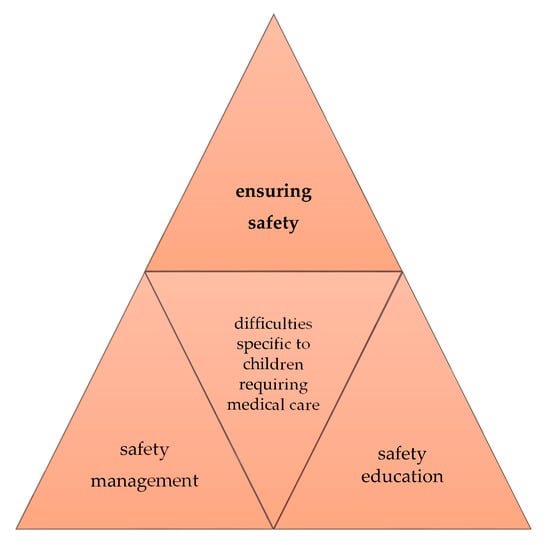 In some cases, special measures may also be required immediately after the occurrence of a major disaster, such as moving mechanical ventilation systems or other medical devices and ensuring sufficient sources of power for these devices. Therefore, safety education for children in general schools should also address new challenges specific to children requiring medical care, represented by the mobility of medical devices and availability of sufficient power supplies, and develop comprehensive systems and approaches to ensure the safety of these children in general schools, as shown in Figure 3. Furthermore, as difficulties vary among children requiring medical care, optimal solutions should be examined with a view to covering issues specific to these children in safety education. This is also important when evaluating the outcomes.