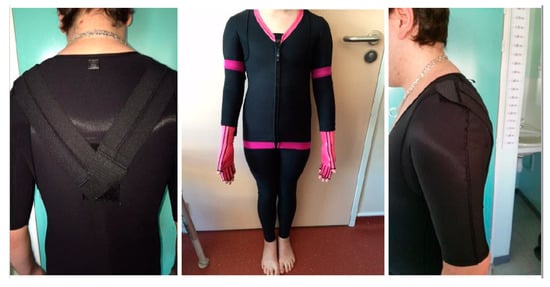 The CGs used in this study were customized based on the needs of each patient by orthotic and prosthetic practitioners (Novatex Medical©). Based on 36 body measurements, CGs included tailor-made pants, vests, and mittens, which covered the entire body of all participants (i.e., trunk and upper and lower limbs; Figure 1). Closure systems varied, according to the behavior of the patients. The vest was attached to the pants by a zipper located at the waist for some patients, and the vest closed in front and/or behind with a zipper. In some clothes, we added zippers at the ends of long sleeves, as well as scapular elastic recoil or removable protective foams applied for the purpose of protection (i.e., biting hands).