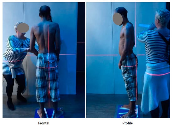 The primary outcome assessed at enrolment and six weeks was postural imbalance with and without CG. We could not measure postural sway using a motorized force platform, as it required too much compliance from our patients. We used a basic, non-instrumented postural test with the vertical of Barré (via a laser) and a blue plank on the floor (see Figure 2) to position the two feet of the patient. We asked patients to stand still while barefoot with arms hanging freely, feet positioned with a Fick angle at 30°, and to focus on a visual reference mark fixed 1.5 m in front of them. We performed a clinical postural analysis, according to Vallier’s classification, in order to identify the type of imbalance affecting the subject [59]. At least two trained orthesists performed the measurements. Several pictures were taken when the posture was considered stable. Postural sway parameters included the anteroposterior (profile) and mediolateral (frontal) sway standard deviations (SD-profile/SD-frontal; mm). We used two approaches to assess changes: the difference between post- and pre-intervention profiles and frontal deviation, and a Clinical Global Impression Likert scale (worse, unchanged, improved, and substantially improved) based on clinician observations during the test. Figure 2 shows the procedure applied to a catatonic patient. Written informed consent was obtained from the patient’s parents for the publication of these images.