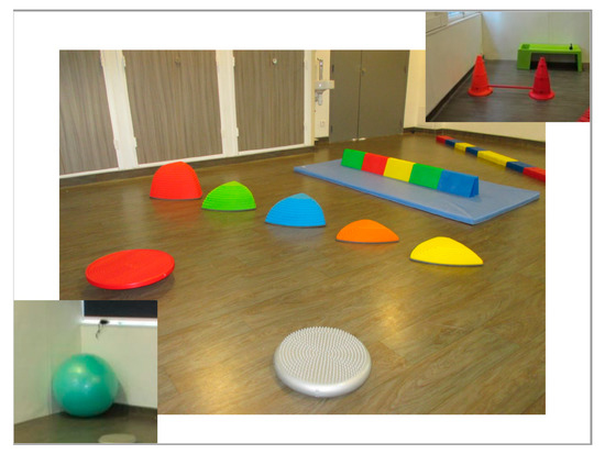 We assessed sensory motricity with two variables at enrolment and six weeks: (1) the Dunn sensory profile to assess sensory integration, which produces 22 sub-scale scores (i.e., auditory processing, visual processing, vestibular processing, touch processing, multisensory processing, oral sensory processing, sensory processing related to endurance/tone, modulation related to body position and movement, modulation of movement affecting activity level, modulation of sensory input affecting emotional responses and activity level, modulation of visual input affecting emotional responses and activity level, emotional/social responses, behavioral outcomes of sensory processing, sensory seeking, emotionally reactive, low endurance/tone, oral sensory sensitivity, inattention/distractibility, poor registration, sensory sensitivity, sedentary, and fine motor/perceptual) and a total score [57]; and (2) a self-designed motricity path to assess motor performance (Figure 3). Two occupational therapists adapted the simplest tasks from standardized tools, such as the Movement Assessment Battery for Children, 2nd edition (MABC-2) [60] to assess gross mobility. The scenario included ten workshops requiring general dynamic co-ordination (jumping, walking, and balance). The evaluation was based on a review of the video and of the fulfillment of a certain number of qualitative observation criteria, defined according to three variables: “yes”, “no”, and “emerging”. Fifty items were assessed. This course was performed on Day 0 without CGs and after six weeks of intervention with CGs. The sequences of the tasks were not repeated, in order to avoid motor learning between sessions. All tasks were performed in the same room and by the same professional team at the child psychiatry department of the Pitié-Salpêtrière Hospital. When CGs were indicated after discharge, a time-lapse was respected such that the patient could adapt to his/her non-hospital environment.