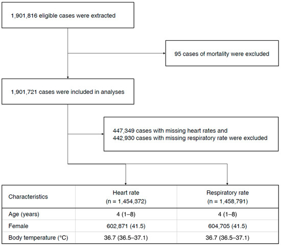 This study has several limitations. First, this was a retrospective study which extracted the data from the registry. Since the data of this study were provided anonymously, the possibility that the HR or RR of the same patient being included more than once cannot be excluded. In addition, we could not control for all other factors, excluding fever, which could potentially affect the vital signs of children at Eds, such as pain, anxiety, and method of measurement. Second, to remove possible conditions that could affect HR or RR, we removed data of patients with cardiovascular disease, respiratory disease, and those who were admitted to the ICU. However, it was not possible to completely exclude more specific personal characteristics beyond those collected by the NEDIS. These are inherent limitations of de-identified public datasets and these are not specific to this study. Finally, there were some missing values of vital signs. However, this may explain the characteristics of pediatric patients who have difficulty in measuring vital signs compared to adults.