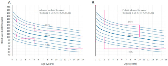 Centile curves for heart rate by age. Centile curves of heart rate by age with visual comparison against the centile curves from advanced pediatric life support (A) and pediatric advanced life support (B) guidelines.