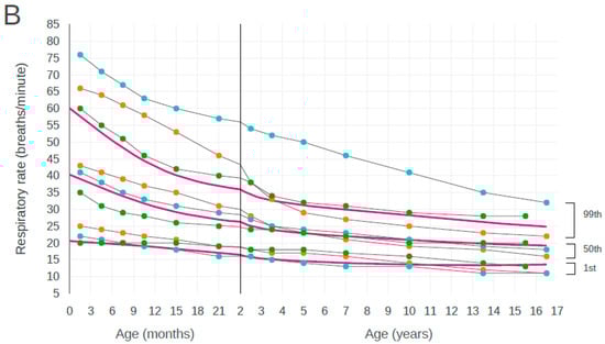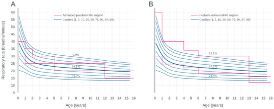 Centile curves for respiratory rate by age. Centile curves of respiratory rate by age with visual comparison against the centile curves from advanced pediatric life support (A) and pediatric advanced life support (B) guidelines.