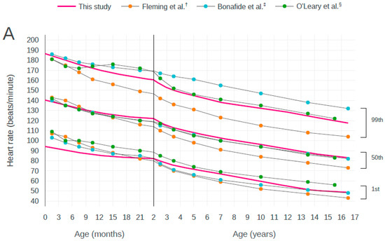We compared our results with the centile curves reported in previous studies [5,6,8]. There were some differences between the centile curves, but there was general agreement that the centiles show a decline in HR and RR from birth to early adolescence. In curves for both HR and RR, the ranges indicated by Bonafide et al. (from the 1st centile to the 99th centile) were the widest for almost all ages (Figure 5).