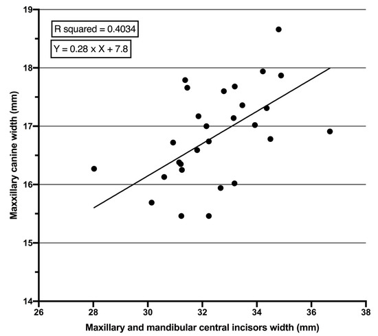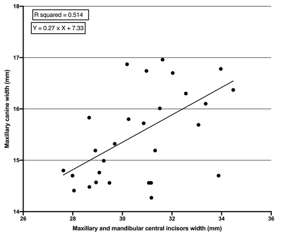 It is important to acknowledge that no study has yet been carried out among a Kurdish population to determine the mesio-distal width of unerupted PMCs. Being able to anticipate the future impaction or malocclusion of PMCs would be of great value in terms of potentially leading to early intervention to prevent or reduce the impact of the associated problems. In general, the quality of the prediction method based on regression analysis depends on the selected independent variables. In the United States, the sum width of mandibular incisors has been preferred as the independent variable [9,24]. In contrast, the European schools prefer the sum width of maxillary incisors as the independent variable [25]. In this study, the sum width of permanent maxillary and mandibular central incisors (PMMCIs) were examined as the independent variable that represents the combination of both schools. Accordingly, the aim of the present pilot study is to find a specific prediction equation for the estimation of mesio-distal width of PMCs that can be useful as a part of MDSA and depends on the sum width of PMMCIs in a sample of the Kurdish population. There was a null hypothesis of no association of width of PMMCIs with width of PMCs.