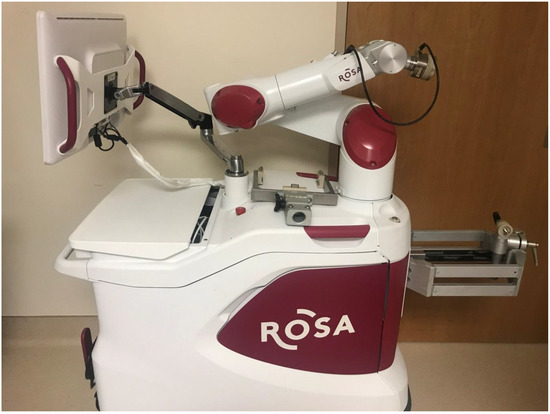 Robotic stereotactic assistance, or ROSA® (Medtech, Montpellier, France), is a computer-controlled robotic arm with an integrated platform that combines image-guided neurosurgical planning software with robotic navigation to assist neurosurgeons with minimally invasive procedures. ROSA® incorporates four main components: the robot stand, a retractable telescopic support arm, a touch-screen, and a robotic arm (Figure 1). Preoperative images are registered to the patient’s facial features via laser scanning; ROSA® then aligns to the appropriate planned trajectory (Figure 2). The system allows for planning of multiple trajectories using computerized tomography (CT) and magnetic resonance imaging (MRI) [1]. ROSA® has been used for functional and stereotactic neurosurgery, endoscopic surgery, and open skull procedures. Its use is most reported for lead placement for deep brain stimulation, frameless stereotactic biopsies, laser ablation of epileptogenic foci, endoscopic third ventriculostomy, and depth electrode placement for seizure monitoring [1,2,3,4].