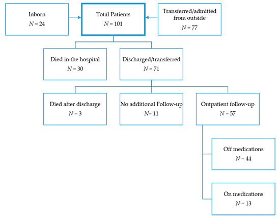 Of the 101 patients, 71 (70.3%) were discharged or transferred from our hospital alive either from their initial NICU stay or from the hospitalization in which PH was diagnosed at a median age of 235 (IQR 168–296, range 57–663) days. A total of 22 (31.0%) patients were transferred back to an outside institution, 33 (46.5%) were discharged to a rehabilitation facility, and 16 (22.5%) were discharged home (Figure 1).