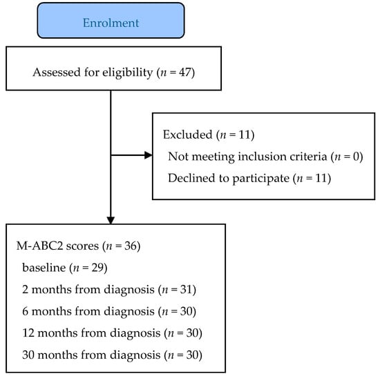 The Movement Assessment Battery for Children-2 (M-ABC2) [20] was used to measure motor performance. The M-ABC2 is as a valid instrument to measure motor performance in this population [7,21]. The measurement points were 0, 2, 6, 12 and 30 months from the diagnosis. The tests were conducted by a physiotherapist at the hospital during the routine appointments or inpatient stays.