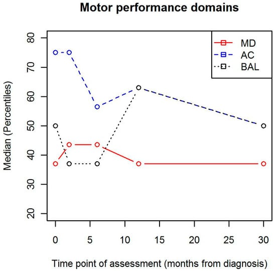 The change in motor performance domains (aiming and catching, balance, manual dexterity) are illustrated in Figure 2, and the descriptive values are presented in Table 2. Of the three domains, aiming and catching (AC) scores decreased significantly between the baseline (the time of diagnosis) and the last (30 month) measurement point (median, interquartile range (IQR), 75 (45) vs. 50 (52.25), respectively, p = 0.047). Balance (BAL) was affected the most at the 2-month (median (IQR), 37 (54), p = 0.008) measurement point, when compared to the 12-month (median (IQR), 50 (66)) measurement point. The differences between the scores at different time point were not significant regarding manual dexterity (MD) in any comparisons.