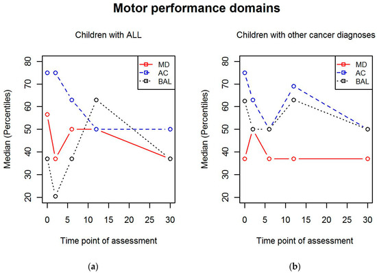 The changes in the different domains of motor performance during treatment in (a) children with acute lymphoblastic leukemia (ALL) and (b) children with other cancer diagnoses. MD = manual dexterity; AC = aiming and catching; BAL = balance.