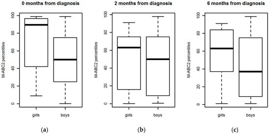Regarding manual dexterity, De Luca et al. found that manual dexterity (measured with M-ABC2) was below the values of the normative population at 13 to 24 months-off-treatment in children with ALL [22]. They did not find gender differences on total test scores in M-ABC2. However, it must be noted that they included patients aged two-and-a-half to five years at the time of diagnosis and only children with ALL, so our samples are not fully comparable. In the healthy children’s population, findings suggest that motor performance differences between girls and boys vary depending on the type of task [27]. This was also evident in our study, as we found that girls performed better in manual dexterity. If we discuss this finding through traditional stereotypes, girls might be spending more time in fine motor activities, such as drawing, than boys [27]. This is, however, just speculation. The differences between genders may also be due to biological maturation differences in girls and boys at different ages.