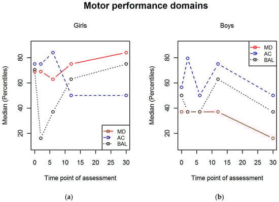 Scores for motor performance domains in (a) girls and (b) boys. MD = manual dexterity; AC = aiming and catching; BAL = balance.